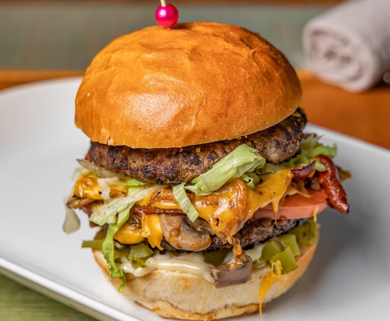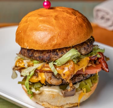 Double Beef Patty, Crispy Bacon, Cheesy Mushroom, Lettuce, Tomato with Pickle & Mayo Sauce
