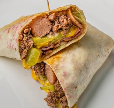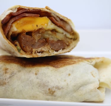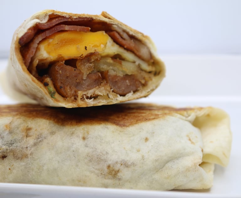 Bacon, Eggs, Sausage, Hashbrown, Cheese with BBQ Sauce in toasted Wrap.