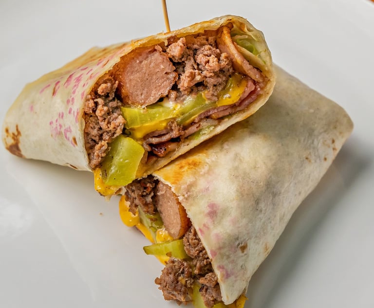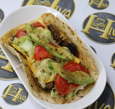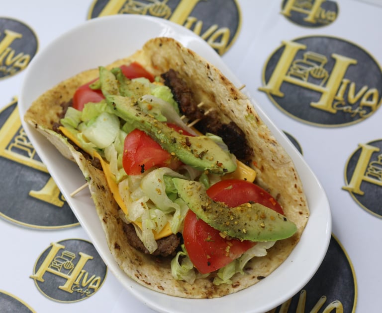 Pressed Beef Mince on warp, rolled back in Taco shape filled with Avocado, Lettuce, Tomato, red onion with Chili Sauce