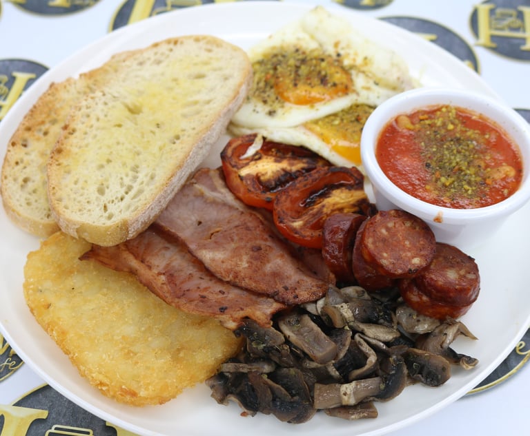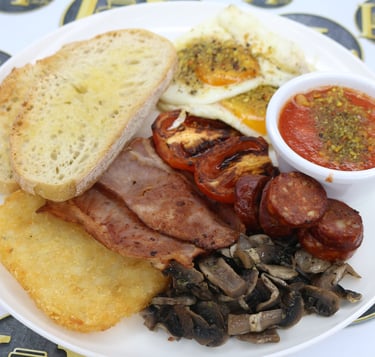 Bacon, Eggs, Sauteed Mushroom, Hashbrown, Chorizo, Cannellini beans, Grilled Tomato with Sourdough bread.